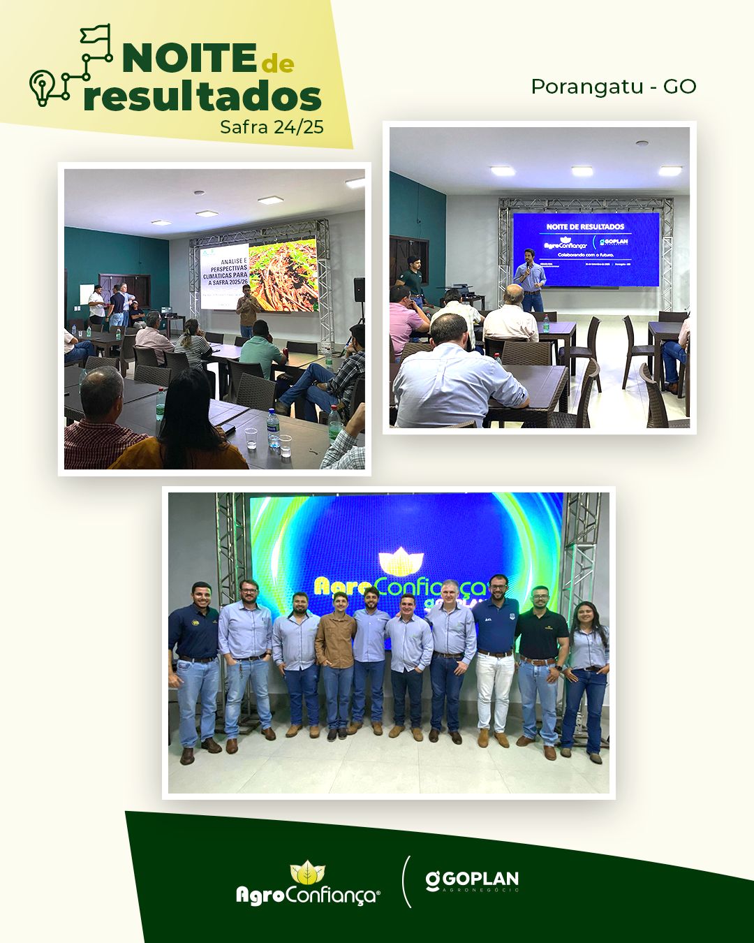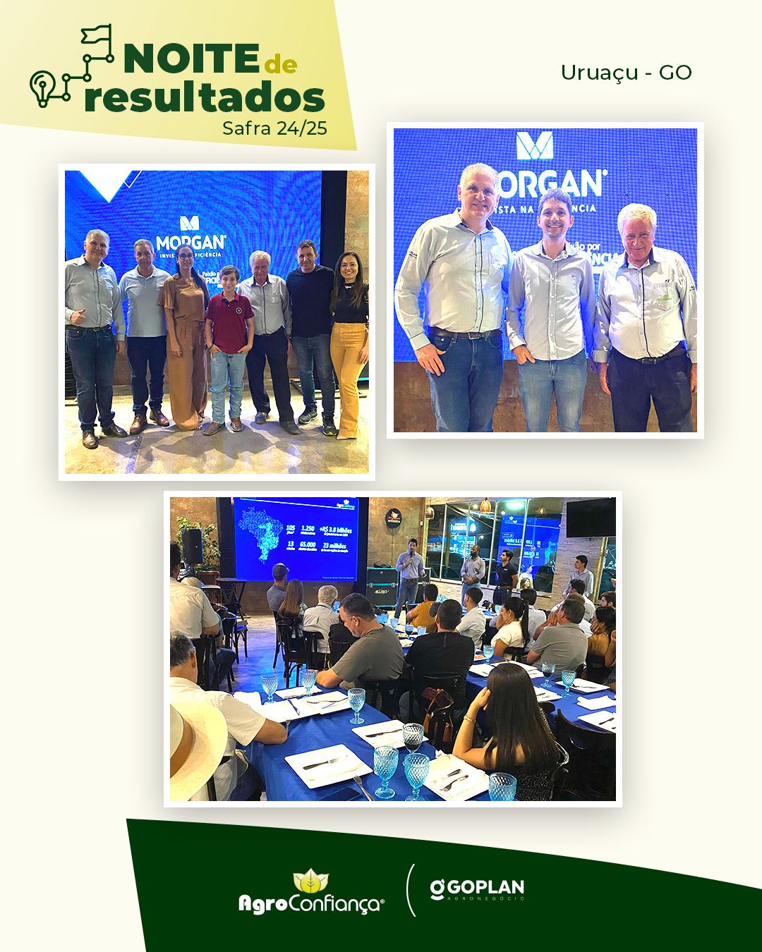 A Noite de Resultados da Agroconfiança foi realizada em Uruaçu e Porangatu, em parceria com a Morgan Sementes e a ICL América do Sul. O encontro reuniu produtores e parceiros para apresentar dados concretos da safra 24/25 e informações estratégicas que apoiam o planejamento da nova temporada.
